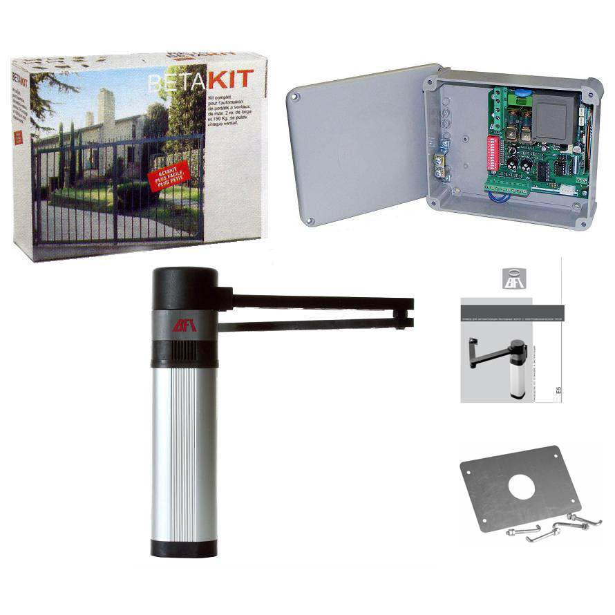 Автоматика BFT E5 для распашной калитки весом створки до 200 кг. и шириной створки до 1,8 метра. Данный привод в комплекте с элекромеханическим редуктором, сделан очень компактным, что позволяет устанавливать его практически к любому столбу. Запирание и разблокировка ворот обеспечивается дополнительным электромеханическим замком. Разблокировка электромеханического замка и открытие ворот осуществляется дистанционно с помощью пульта дистанционного упаравления.